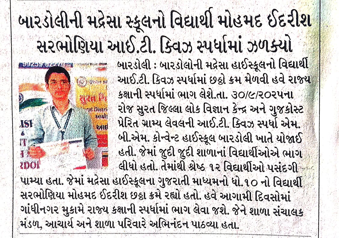 બારડોલી કુમાર શાળા ખાતે તાલુકા કક્ષાનું વિજ્ઞાન–ગણિત અને પર્યાવરણ પ્રદર્શન ૨૦૨૨-૨૩ નું આયોજન કરવામાં આવ્યું હતું. જેમાં મદ્રેસા-હાઈસ્કૂલ બારડોલી, પ્રાથમિક વિભાગ ગુજરાતી માધ્યમની રજૂ કરેલ કૃતિ “ pa” નો પ્રથમ નંબર પ્રાપ્ત કરેલ છે. જેમાં ભાગ લેનાર વિદ્યાર્થીની ધુમાડિયા મરીયમ મો.હનીફ અને મિરઝા મુઝમીન તાહીર અને તેના માર્ગદર્શિકા શિક્ષિકા અફસાનાબેન બાનું અને શાલીનીબેન પટેલ ને શાળા સંચાલક મંડળ અને શાળાના આચાર્ય સાબિરભાઈ પટેલ દ્વારા અભિનંદન પાઠવાયા હતા.